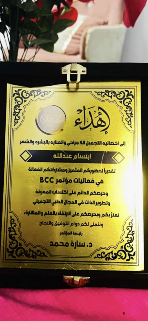 تكريم متميز من فعاليات مؤتمر BCC فى عالم التجميل لأخصائية التجميل والعناية بالشعر والبشرة ابتسام عبداللهعلى الجانب الآخر تتميز اخصائية التجميل ابتسام عبدالله بحضورها فعاليات التجميل والعنايه بالبشره والشعر المختلفة اخصائيه التجميل للبشرة والشعر والتجميل اللاجراحى وكل ما يخص العرائس : ابتسام عبدالله تتألق فى عالم التجميل والفاشون بنت محافظه شمال سيناء تتألق في مجال التجميل والفاشون فى محافظه شمال سيناء مع كوكبه من المتخصصين فى هذا المجال ونالت اشاده واسعه من كل اللى اتعامل معها فى هذا المجال الراقىحيث قامت مؤخرا بافتتاح بيوتى سنتر لها فى محافظه شمال سيناء بعنوان (حواليا كات) تحت إشرافها بمحافظه شمال سيناء العريقه عنوان بيوتى سنتر جوليا كات شارع بحرى قبل شارع مستشفى سيناء التخصصى بجوار بيو كوين أمام مكتبه الشريف رقم هاتف العمل : 01004581090ترحب بكل ما يهتم بمجال التجميل وكل ما يخص العنايه بالبشره والشعر