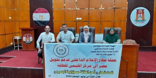 واصل مجمع اعلام الداخلة ، بمحافظة الوادي الجديد ، تنفيذ فعاليات الحملة الاعلامية الموسعة التي أطلقها قطاع الإعلام الداخلي بالهيئة العامة للاستعلامات تحت شعار ” أمن الطاقة مسؤولية الجميع “، وذلك تحت رعاية رئيس الهيئة العامة للاستعلامات الكاتب الصحفي ضياء رشوان، وتحت إشراف وتوجيهات رئيس قطاع الإعلام الداخلي الدكتور أحمد يحيى، من خلال تنظيم ندوة توعوية اليوم بالوحدة المحلية لمركز ومدينة بلاط ،تحت عنوان ” آليات تعزيز الوعي العام بأهمية مشروعات الطاقة وفوائدها الإقتصادية ” .