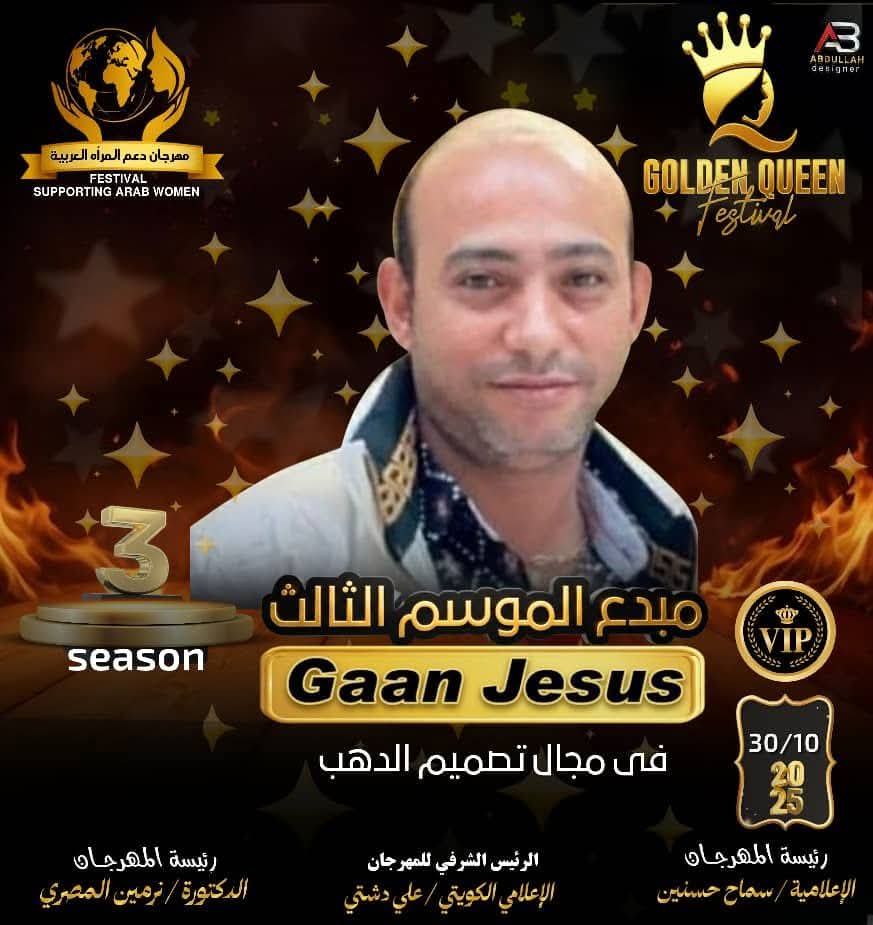 أعلن خبير تصميم الذهب Gaan jesus عن مشاركته في الموسم الثالث لمهرجان(جولدن كوين) برئاسة كلا من الإعلامية، و خبيرة التجميل سماح حسنين والإعلامية، و سيدة الأعمال نرمين المصري، و الصحفي الكويتي علي ديشتي الرئيس الشرفي للمهرجان، والذي سيتم تنظيمه في الثلاثين من شهر أكتوبر القادم بأحد الأماكن الفاخرة في العاصمة عاصمة المصرية القاهرة.