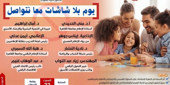 تتناول الندوة الأثر النفسي والاجتماعي لاستخدام الشاشات على الأطفال والمراهقين، وسبل تحقيق التوازن بين الحياة الواقعية والرقمية، وأهمية دور الأسرة والإعلام في توجيه السلوك الرقمي الآمن.