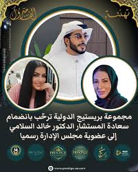 يسرُّ مجلس إدارة مجموعة بريستيج الدولية أن يُعرب عن بالغ اعتزازه وتقديره بانضمام سعادة المستشار الدكتور خالد السلامي إلى عضوية مجلس الإدارة رسميًا، في خطوة نوعية تُجسّد حرص المجموعة على استقطاب القامات الوطنية والدولية ذات الخبرة والرؤية الاستراتيجية.