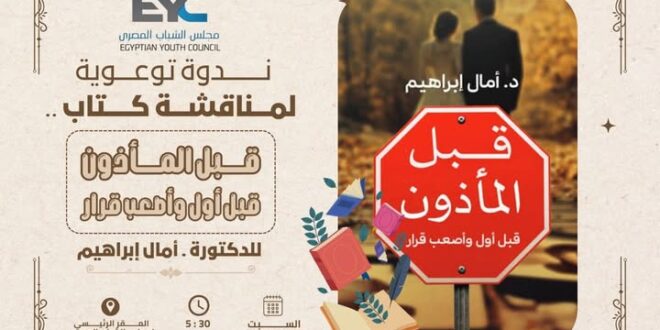 يُعلن البرنامج الوطني لتعزيز الحق في التعليم تحت مظلة مجلس الشباب المصري عن إقامة ندوة توعوية لمناقشة كتاب: «قبل المأذون قبل أول وأصعب قرار » للكاتبة المتميزة /الدكتورة أمال إبراهيم استشاري العلاقات الأسرية