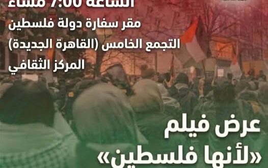 تنظم سفارة دولة فلسطين في القاهرة عرضًا خاصًا للفيلم الوثائقي “لأنها فلسطين”، وذلك في السابعة مساء الثلاثاء الموافق 31 مارس، بمقر المركز الثقافي للسفارة في التجمع الخامس، بحضور المنتجة والمخرجة دينا أبو زيد.