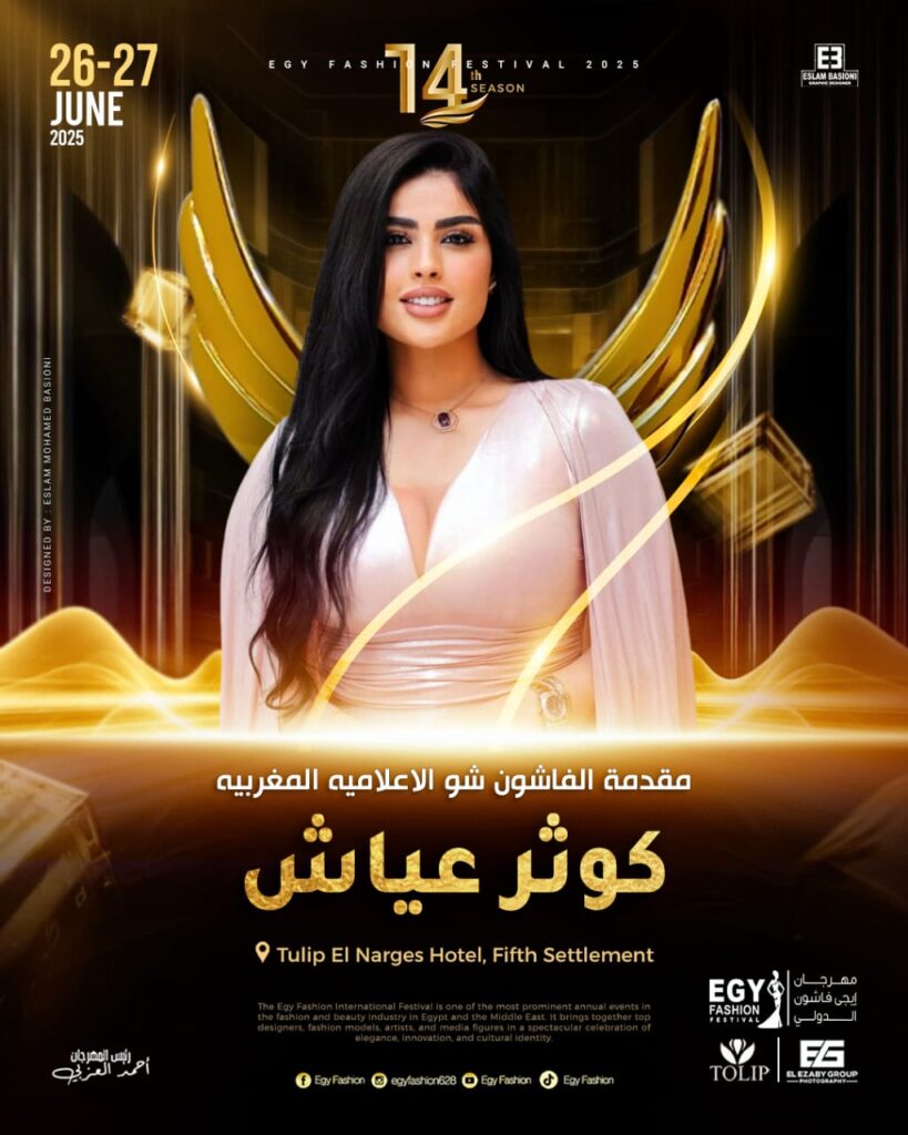 أعلنت الإعلامية المغربية كوثر عياش عن قيامها بتقديم الفاشون شو لمهرجان(إيجي فاشون)في موسمه الرابع عشر برئاسة رجل الأعمال أحمد العزبي والذي سيتم تنظيمه في السادس والعشرين، و السابع و العشرين من شهر يونيو القادم بفندق(توليب النرجس) بمنطقة التجمع الخامس بالعاصمة المصرية القاهرة.