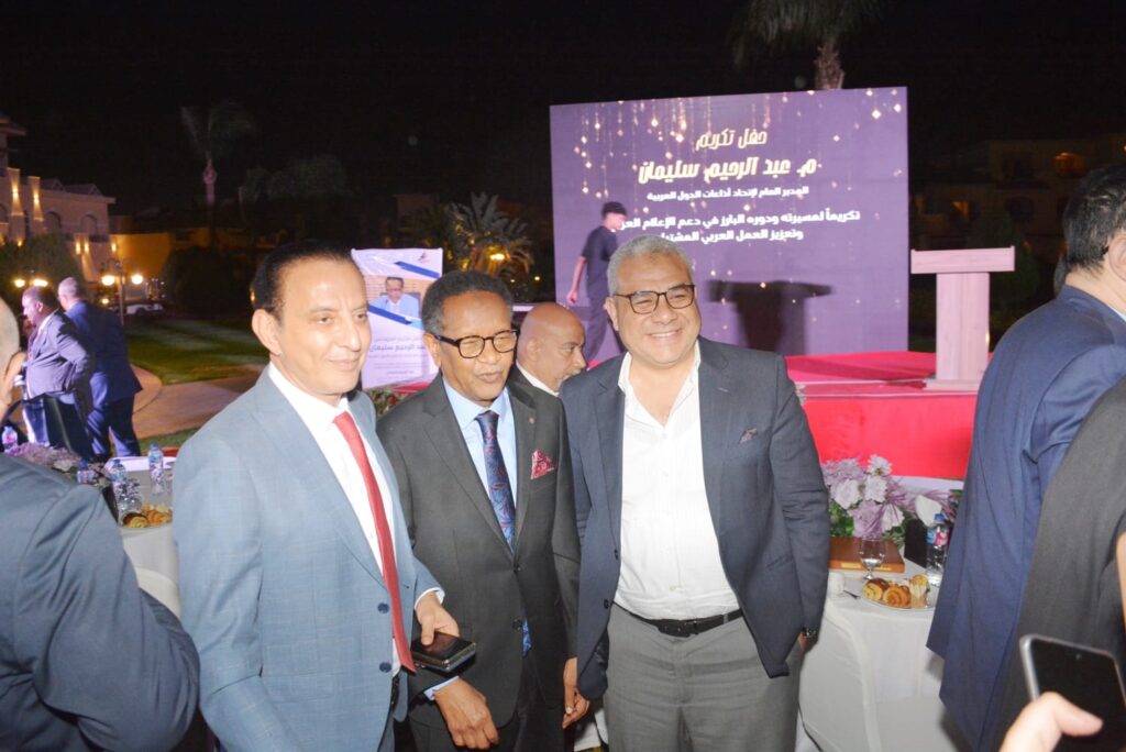 أقيم بالساحة الخارجية لفندق مدينة الإنتاج الإعلامي حفلًا خاصًا على شرف المهندس عبد الرحيم سليمان المدير العام لاتحاد إذاعات الدول العربية، لتكريمه على مشواره المهني الحافل تحت رعاية الاتحاد العام للمنتجين العرب ومدينة الإنتاج الإعلامي والهيئة الوطنية للإعلام في مصر.قدم الحفل الإعلامي السوداني مصعب محمود والإعلامية المصرية أسماء حبشي وبعد ترحيبهما بالحضور، عزف السلام الجمهوري لجمهورية مصر العربية، وتم عرض فيديوهات متنوعة: عن مسيرة المهندس عبد الرحيم سليمان وعن الاتحاد العام للمنتجين العرب وعن اتحاد إذاعات الدول العربية.ثم تحدث الدكتور إبراهيم أبو ذكري رئيس اتحاد المنتجين العرب والذي تحدث عن بداية علاقته بالمهندس عبد الرحيم بمشادة -او خناقة بالعامية المصرية- وبالطبع كانت مهنية وتحولت لصداقة على مدار سنوات، وقال «أبو ذكري» أن عبد الرحيم استطاع أن يجمع بين الهندسة والبرامج والعمل الاجتماعي وتميز في كل الوطن العربي وأعطى قبلة الحياة لاتحاد اذاعات الدول العربية من وجهة نظره.وأضاف أبو ذكري انه في اخر دورة لمهرجان اذاعات الدول العربية في تونس، قرر ان يكرم المهندس عبد الرحيم في القاهرة على مشواره لخدمة الدول العربية ولحبه وروحه المصرية، وعرض الفكرة على الدكتور عبد الفتاح الجبالي رئيس مدينة الإنتاج الإعلامي والكاتب احمد المسلماني رئيس الهيئة الوطنية للإعلام ورحبوا جدا وعلى الفور تم التجهيز للحفل وها نحن اليوم نكرم المهندس عبد الرحيم لنشجعه على الاستمرار في مسيرته بكل قوة.وقد تسلم المهندس عبد الرحيم سليمان المدير العام لاتحاد إذاعات الدول العربية، درعين تكريم من مدينة الإنتاج الإعلامي ومن اتحاد المنتجين العرب وعقب ذلك وجه في كلمته تحية الى مصر قلب العروبة وللدكتور إبراهيم أبو ذكري على فكرة تكريمه وعبر عن شكره باسمه وباسم كل العاملين في اتحاد اذاعات الدول العربية على هذا التكريم.وأضاف سليمان ان اتحاد الإذاعات في تونس يمضي في مسيرة التحديث برعاية الأمين العام لجامعة الدول العربية السيد أحمد أبو الغيط، ويحرص على امتلاك التكنولوجيا لجميع أعضاء الاتحاد ليستمتع المشاهد والمستمع العربي لكل ما هو جديد ومميز في صناعة المحتوى الإعلامي والفني.واشاد سليمان بالعلاقات القوية بين السودان ومصر فهي بلده الثاني ويأمل دوام التوفيق لهما واكد على ان هذا التكريم سيكون حافزا له لبذل المزيد من الجهد في رفعة الاعلام العربي الى عنان السماء.وفي لفتة جميلة من الاخوة السودانيين فقد تم تدشين مبادرة بعنوان «شكرا مصر» تعبيرا من الضيوف السودانيين المقيمين في مصر منذ الحرب الاهلية وتسمية شارع باسم مصر في مدينة بورتسودان وفي هذا السياق تم تكريم دكتور إبراهيم أبو ذكري بدرع المبادرة.حضر الحفل: عمر الفاروق سيد كامل نائب السفير السوداني بالقاهرة، السفير محمد خير عبد القادر مدير إدارة الاتحادات والمنظمات العربية السابق، الدكتورة هدى يسى رئيس اتحاد المستثمرات العرب، مجدي لاشين الأمين العام للهيئة الوطنية للإعلام، الإعلامي سمير عمر رئيس قطاع الأخبار بالشركة المتحدة والإعلامي طارق علام والإعلامي محمد بدر رئيس احتفالية ميديا آيدول، المخرج عمرو عابدين والمخرج خالد شبانة والمخرج هاني فؤاد، الدكتورة أماني فاروق، المنتجة ميريت أبو ذكري والمنتجة شيرين مجدي والمنتج جورج وصفي، المغني سامح يسري، الإعلاميين السودانيين: مزمل سليمان حمد و إبراهيم البزعي من إذاعة وتلفزيون السودان.