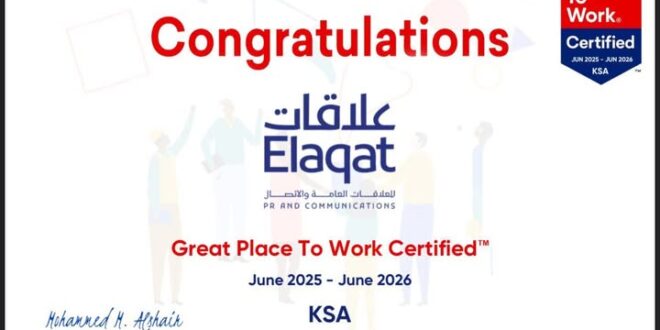 ويمثل حصول “علاقات” على هذه الشهادة تأكيدًا جديدًا على التزامها بمبادئ التمكين والاحترافية والرفاه الوظيفي، وتجديدًا لعهدها في مواصلة بناء بيئة عمل تحترم الإنسان، وتُعزز القيم المؤسسية التي ترتكز عليها صناعة الاتصال النوعي في العالم العربي.